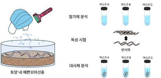 연구팀은 세 종류의 일회용 마스크(KF94, 의료용, 방진용)와 비교용 폴리프로필렌(PP) 원료를 각각 표준 토양에 혼합하여 예쁜꼬마선충의 생식력과 대사에 미치는 영향을 실험했다.