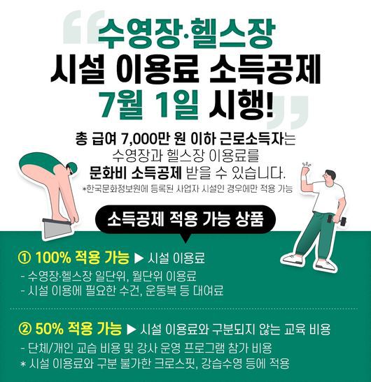 문화체육관광부(장관 유인촌, 이하 문체부)는 한국문화정보원(원장 정운현)과 함께 7월 1일부터 전국 1000여 개 헬스장·수영장 시설이용료에 대해 소득공제를 받을 수 있게 된다고 30일 밝혔다.