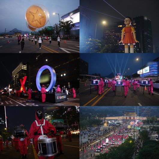 먼저, 광화문광장에서 서울광장까지 이어진 퍼레이드는 ‘오징어 게임’을 대표하는 상징적인 아이콘들로 이루어져, 다채로운 공연과 화려한 볼거리로 팬들의 눈과 귀를 사로잡았다. ○△□가 그려진 거대한 게임 초대장부터 핑크관, 돼지저금통, 달고나 풍선, 회전목마 등 아이코닉한 조형물과 핑크가드 마칭밴드의 피날레 연주가 퍼레이드 행렬에 함께해 현장을 뜨겁게 달궜다. 서울 도서관 외벽에는 ‘오징어 게임’ 컨셉의 미디어 파사드가 펼쳐져 이색적인 퍼포먼스로 퍼레이드에 특별함을 더했다. 여기에 서울광장에서는 ‘영희’와 ‘철수’의 줄넘기 게임, 딱지맨 게임 등 팬들이 직접 참여할 수 있는 포토존과 체험존이 마련되어 ‘오징어 게임’ 속 세계관을 생생하게 경험할 수 있는 특별한 공간 또한 마련했다.