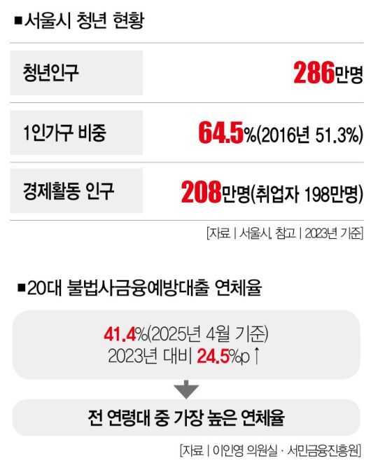이인영 더불어민주당 의원실에 따르면, 올해 4월 기준 20대의 불법사금융예방대출 연체율은 41.4%로 2023년(16.9%) 대비 24.5%포인트나 높아졌다. 전 연령대(30대 36.8%ㆍ40대 34.8%ㆍ50대32.1%ㆍ60대 이상 29.3%) 중 가장 높은 수준이다.