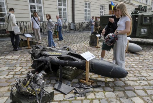 지난 27일(현지시간) 우크라이나 리비우에서 열린 야외 전시회에서 우크라이나 시민들이 도네츠크 지역 전투 중 러시아가 사용했던 다양한 유형의 무기가 전시된 모습을 바라보고 있다. /EPA·연합 |
