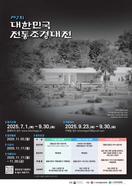 공모는 ▲전통조경 디지털 설계 ▲근현대 전통조경공간 사진 및 영상 ▲전통조경 우수시공사례 3개 부문으로 진행된다.