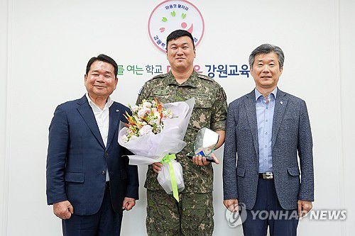 (춘천=연합뉴스) 양지웅 기자 = 강원특별자치도교육청은 30일 최근 발생한 홍천강 물놀이 사고 당시 위험을 무릅쓰고 학생 2명을 구조한 진강섭 육군 11기동사단 상사에게 감사패를 전달했다.