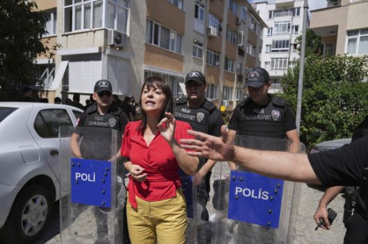 튀르키예 인민민주당(DEM)의 케즈반 코누크주 의원이 29일(현지시간) 이스탄불에서 퀴어 퍼레이드를 막는 경찰과 대치하고 있다. 2025.6.29 AP 연합뉴스 |