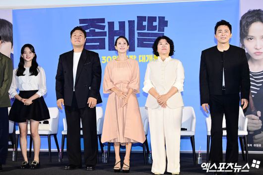 (엑스포츠뉴스 박지영 기자) 30일 오전 서울 용산구 CGV 용산아이파크몰에서 영화 '좀비딸' 제작보고회가 열렸다. 이날 제작보고회에 참석한 배우 최유리, 윤경호, 조여정, 이정은, 조정석이 인사하고 있다.박지영 기자 jypark@xportsnews.com