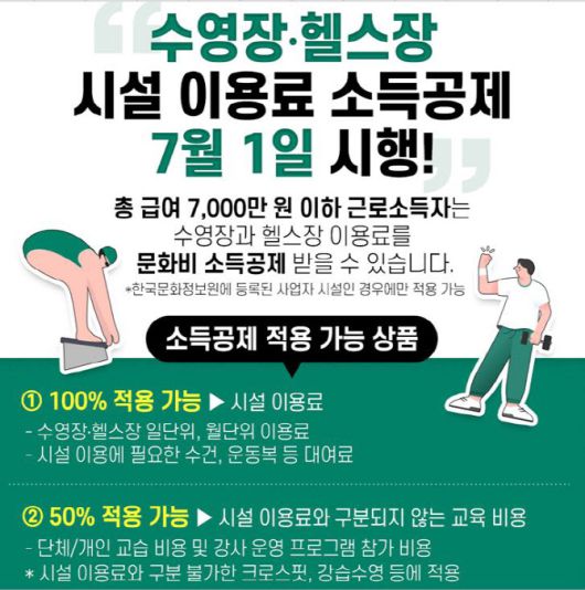 [이데일리 김미경 기자] 문화체육관광부는 한국문화정보원과 함께 7월 1일부터 전국 1000여 개 헬스장·수영장 시설이용료에 대해 소득공제를 받을 수 있게 된다고 30일 밝혔다.