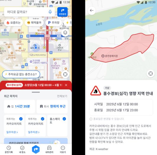 홍수 관련 위험 정보를 제공하는 카카오내비 화면 예시 [사진=카카오모빌리티] |