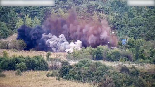 지난해 10월15일 북한이 군사분계선(MDL) 북쪽에서 남북을 연결하는 도로를 폭파하고 있다. 합동참모본부 제공 |
