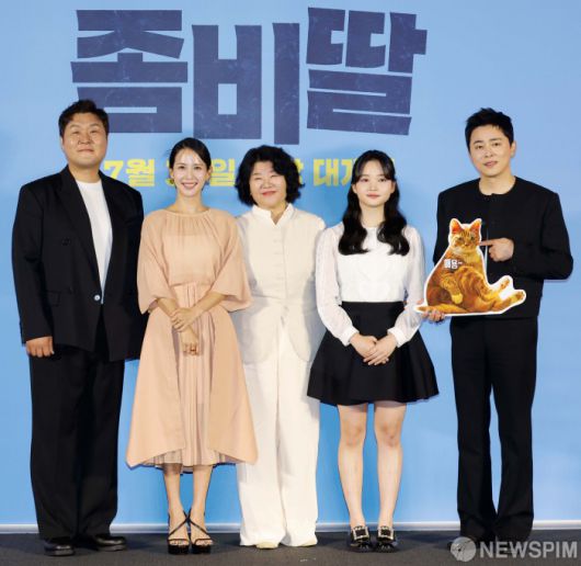 [서울=뉴스핌] 류기찬 인턴기자 = 배우 윤경호(왼쪽부터), 조여정, 이정은, 최유리, 조정석이 30일 오전 서울 용산구 CGV 용산아이파크몰에서 열린 영화 '좀비딸' 제작발표회에서 포즈를 취하고 있다. '좀비딸'은 이 세상 마지막 좀비가 된 딸을 지키기 위해 극비 훈련에 돌입한 딸바보 아빠의 코믹 드라마다. 내달 30일 개봉. 2025.06.30 ryuchan0925@newspim.com