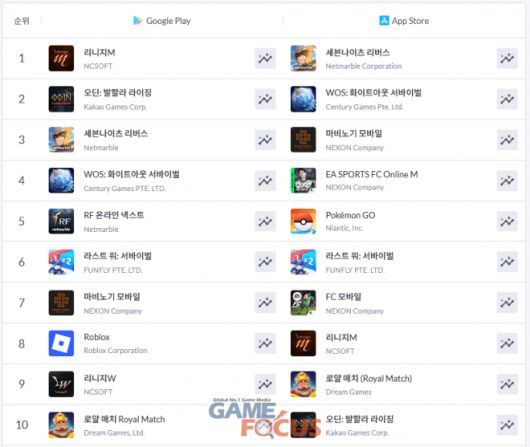 구글 플레이에서는 '리니지M'이 1위 자리를 지키는 한편, '오딘: 발할라 라이징'과 'RF 온라인 넥스트', '리니지W'가 TOP 10 내에 이름을 올렸다. 특히 '오딘: 발할라 라이징'은 서비스 4주년을 기념한 대규모 업데이트 효과로 순위가 크게 상승했다. '마비노기 모바일'은 소폭 순위가 하락했으며, '브라운더스트2'와 '젠레스 존 제로', '승리의 여신:니케' 등도 상위권에 이름을 올렸다.