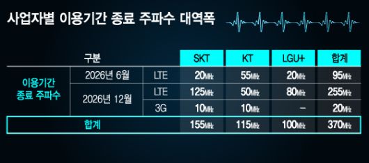현재 LTE 95㎒폭은 내년 6월, 3G 20㎒폭·LTE 255㎒폭 등 275㎒은 같은 해 12월 이용 기간이 만료된다. 3G 주파수는 현재 최소 주파수 대역폭(SK텔레콤 10㎒폭, KT 10㎒폭 총 20㎒폭)을 사용해 서비스를 제공 중이다. LG유플러스는 2G 이후 LTE로 직행해 3G 이용자가 없다.