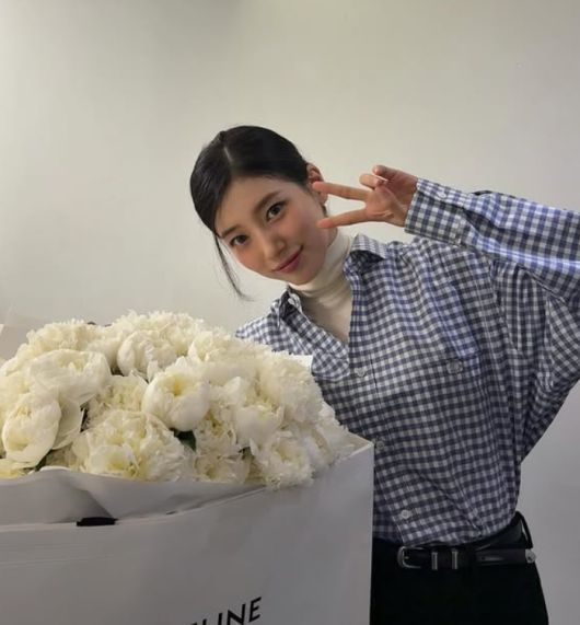 흰색 피오니 꽃다발을 옆에 두고 밝은 미소를 짓고 있는 사진은 사랑스러운 분위기를 더했다. 흰색 터틀넥 위에 체크 셔츠를 매치한 캐주얼한 차림으로 청순하면서도 발랄한 매력을 뽐냈다.