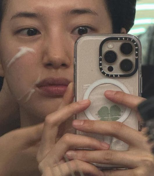 거울 셀카를 찍는 수지의 선명한 이목구비가 돋보인다. 긴 생머리를 늘어뜨린 채 정면을 응시하는 수지는 무결점 피부와 또렷한 눈매로 보는 이들의 감탄을 자아냈다. 얼굴에 제품을 바르고 있는 듯한 사진은 잡티 하나 없는 깨끗한 피부가 인상적이다.