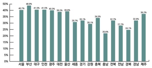 여성공무원 비율이 높은 지역은 부산(57.5%), 서울(55.4%), 인천(54.3%) 순이다.