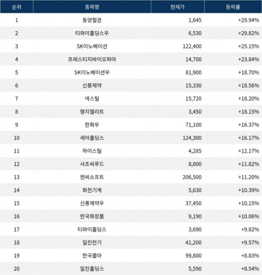 이어 상승률 2위 티와이홀딩스우(36328K)는 주가가 29.82% 폭등하며 종가 6,530원에 상승 마감했다. 상승률 3위 SK이노베이션(096770)의 주가는 122,400원으로 25.15% 폭등하며 강세를 보였다. 상승률 4위 프레스티지바이오파마(950210)는 23.84% 상승하며 14,700원에 마감했다. 상승률 5위 SK이노베이션우(096775)는 18.70%의 급등세를 타고 종가 81,900원에 마감했다.
