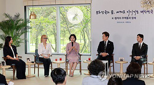 (서울=연합뉴스) 홍해인 기자 = 이재명 대통령과 김혜경 여사가 30일 서울 용산 대통령실 파인그라스에서 문화예술계 수상자들과 간담회를 하고 있다. 2025.6.30 [대통령실통신사진기자단]