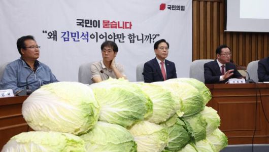 30일 국회에서 열린 김민석 국무총리 후보자 국민청문회장에 배추가 놓여있다. 뉴시스 |