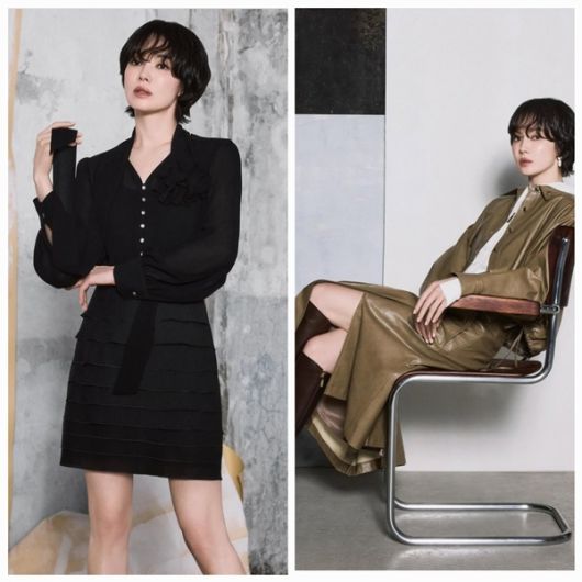 공개된 사진에서는 가을의 광택을 닮은 레더 셋업부터, 겨울을 품은 크림 트위드, 모던한 블랙 셔링 원피스, 그리고 따스한 브라운 슬릿 드레스까지 총 4가지 룩을 완벽하게 소화했다. 특히 각기 다른 소재와 톤에서도 느껴지는 공통점은 단 하나였다. ‘송혜교는 어떤 의상도 송혜교답게 만든다’는 점이었다.