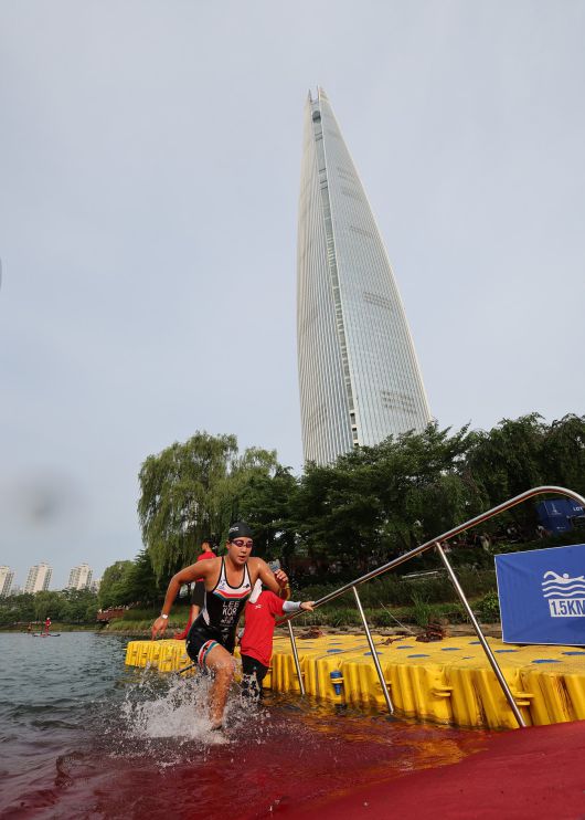 석촌호수 수영을 마치고 나오는 '2024 롯데 아쿠아슬론' 참가자. /롯데물산 제공 |