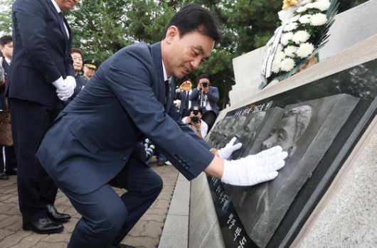 지난 29일 경기 평택시 해군 제2함대사령부에서 열린 '제2연평해전 승전 23주년 기념식'에서 안규백 국방부 장관 후보자가 해전 영웅들의 얼굴 부조상을 어루만지고 있다. 뉴스1 |