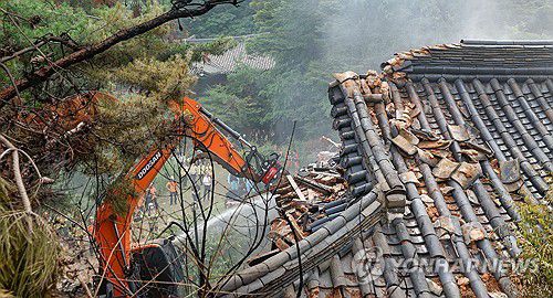 기와지붕 구조상 물이 잘 들어가지 않아 굴삭기와 포크레인 등을 동원해 방수 작업을 할 수밖에 없었다는 것이 소방당국의 설명이다.