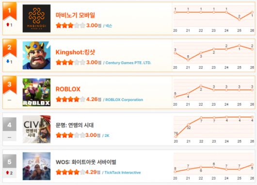 한때 장기간 1위를 지켰던 ‘세븐나이츠 리버스’는 아쉽게도 이번 주 13위까지 떨어지며 하락세가 뚜렷해졌다. 반면, ‘로블록스’는 3위 자리를 안정적으로 유지했고, ‘킹샷’은 1일천하 1위를 찍은 뒤 2위로 내려앉았다.