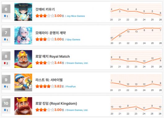 ‘WOS: 화이트 아웃 서바이벌’은 지난주에 이어 Top 5 재진입에 성공하며 저력을 보여줬다. ‘갓깨비 키우기’는 다소 숨을 고르며 6위에 자리했지만, 언제든 반등할 여지를 남겨두고 있다. '로얄매치(8위)'와 ‘로얄킹덤(10위)' 역시 드림게임즈의 저력을 과시하며 TOP 10을 지켰다.