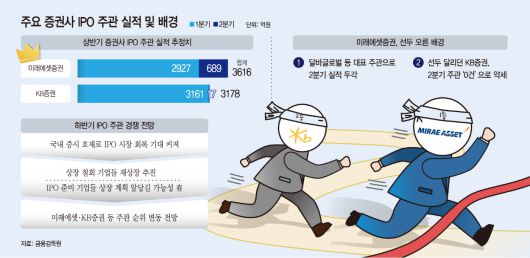 미래에셋증권은 올해 1분기까지만 해도 2927억원의 주관 실적을 거두면서 KB증권(3161억원)을 뒤쫓는 상태였다. 2위에 머물러 있던 미래에셋증권이 선두를 차지할 수 있었던 건 5월 말 상장한 달바글로벌을 단독 대표 주관한 영향이 크다.