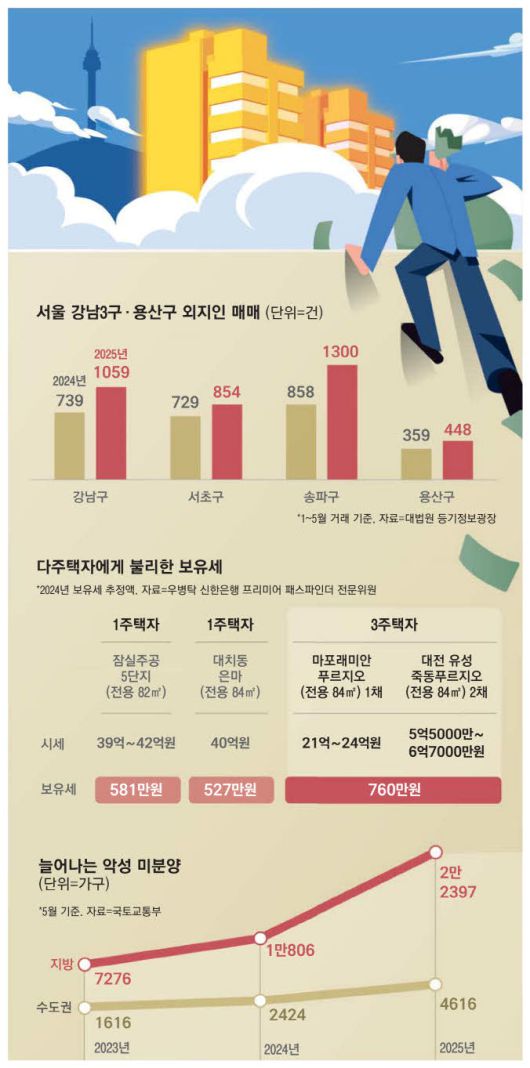 30일 부동산 업계에 따르면 현재 2주택자는 부동산 구입 때 취득세, 보유에 따른 종합부동산세, 매매 시 양도소득세까지 부동산 모든 생애주기에서 세금을 중과받고 있다. 한국에서는 누구나 1가구 1주택이어야 한다는 얘기다. 이런 상황에서 다주택자들은 지방 보유 주택을 정리하고 서울 주요 상급지로 몰려든다. 지방은 아파트를 새로 지어도 '미분양'에 허덕이고 서울은 거래량과 매매가격이 급등하는 것이다.