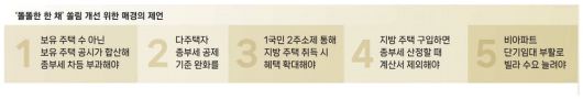 가장 급한 건 종부세 가구 합산 금액 기준을 개편하는 일이다. 2023년부터 공시가격 12억원 이하인 주택을 한 채 가진 사람은 종부세를 내지 않고 다주택자는 9억원까지 공제받는다. 문제는 12억원짜리 집 한 채를 지닌 사람은 종부세를 안 내지만 4억원짜리 집 3채를 가진 사람은 똑같은 부동산 자산 12억원을 보유하고도 9억원을 제외한 3억원에 대해 종부세를 내야 한다는 점이다. 박합수 건국대 부동산대학원 겸임교수는 "보유 주택 수가 아닌 보유 주택 공시가격을 합산해 세금을 차등 부과하는 것이 조세 정의에 맞고 똘똘한 한 채 현상도 막아 지방 부동산 경기를 되살릴 수 있다"고 말했다.