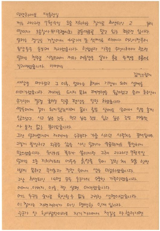 14명이 희생된 오송 지하차도 참사 2주기를 앞두고 한 유족이 이재명 대통령에게 보낸 편지의 일부다. 이 유족은 오는 7월15일 저녁 6시30분께 충북도청 앞에서 열 예정인 오송 참사 2주기 추모제에 이 대통령의 참석을 바라는 편지를 보냈다. 이 유족은 지난 2023년 7월15일 청주 오송 궁평2지하차도 참사 때 어머니를 잃었으며, 오송 참사 유가족 대표를 맡은 최은경씨다.