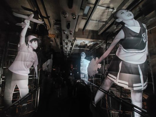 교토 옛 황궁 남쪽 교토신문사 지하층 윤전실 공간에 파격적으로 설치된 프랑스 출신 사진가 제이알의 근작 ‘교토 연대기’의 전시 모습. 윤전실 공간의 한가운데 난간통로를 걸어가면 양쪽에 교토의 남녀노소 시민들을 클로즈업한 사진 조형물이 조명을 받으면서 잇따라 등장하고 각 시민들이 자신의 삶에 대해 털어놓는 육성(나레이션)이 울려온다. 노형석 기자