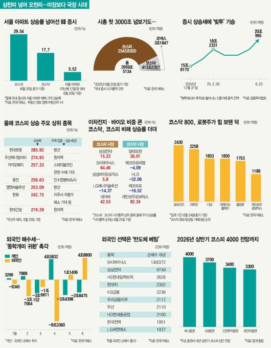 증권가에서는 동학개미 귀환이 코스피 ‘불장’을 이끌 수 있다고 전망한다. 외국인이 주도한 시장을 동학개미가 이어받은 셈이다. 연초 3000이던 증권사 리서치 목표치 상단은 4000선까지 올라섰다. 이재명 대통령이 내세운 ‘코스피 5000’의 꿈도 한 걸음 더 가까워졌다.