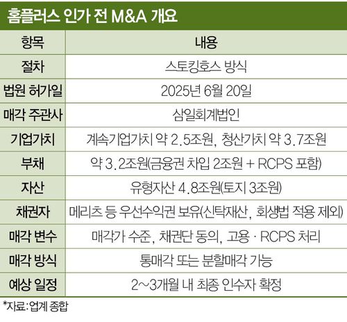 이번 M&A는 조건부 인수 계약 체결 이후 공개 경쟁 입찰로 인수 희망자를 모색하는 ‘스토킹호스(Stalking Horse)’ 방식으로 진행된다. 사전에 내정된 인수자가 기준선 역할을 하되, 공개입찰 과정에서 더 유리한 조건이 제시되면 새 인수자가 선정되는 방식이다. 매각 주관사는 삼일회계법인이다. 삼일회계법인은 법원이 지정한 조사위원으로, 앞서 홈플러스 재무 상태를 평가한 조사보고서를 법원에 냈다. 조건부 인수 계약 체결과 공개입찰을 거쳐 최종 인수자 선정까지는 2~3개월가량 걸린다.