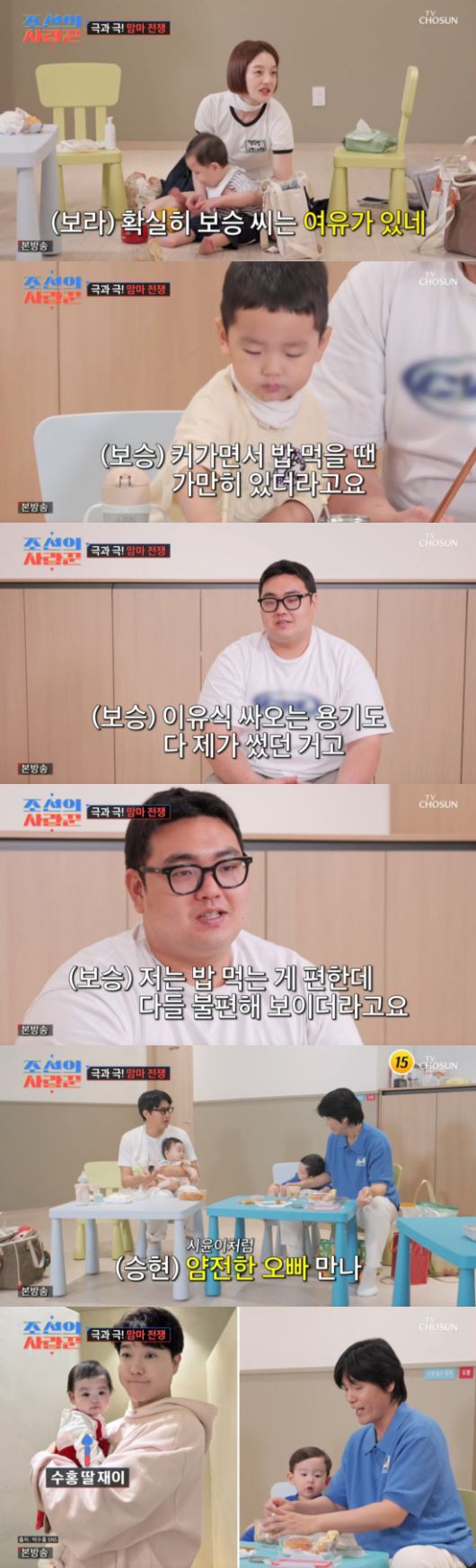 또 황보라는 "확실히 보승 씨는 이훈이가 제일 크니까 (밥 먹을 때) 여유가 있다"라며 밝혔고, 손보승은 "점점 밥 먹을 때 가만있더라. 원래 밥도 잘 안 먹었는데 혼자 먹으려고도 하고"라며 전했다. 최성국은 "아기가 분유 먹을 때가 편한 거다"라며 너스레를 떨었다.