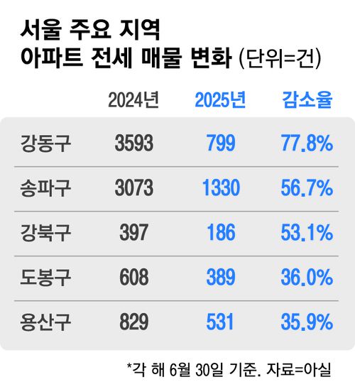 30일 부동산 정보업체 아실에 따르면 이날 기준 서울 전세 물건은 2만4279건으로 지난해 같은 날(2만7862건) 대비 12.9% 줄어들었다. 2023년 대비로는 29.1% 감소한 수치다. 특히 대규모 주거지가 밀집된 강동구와 송파구 등의 감소폭이 두드러졌다. 강동구는 1년 전(3593건)보다 77.8% 줄어든 799건을 기록했고, 송파구도 같은 기간 3073건에서 1330건으로 53.2% 감소했다.
