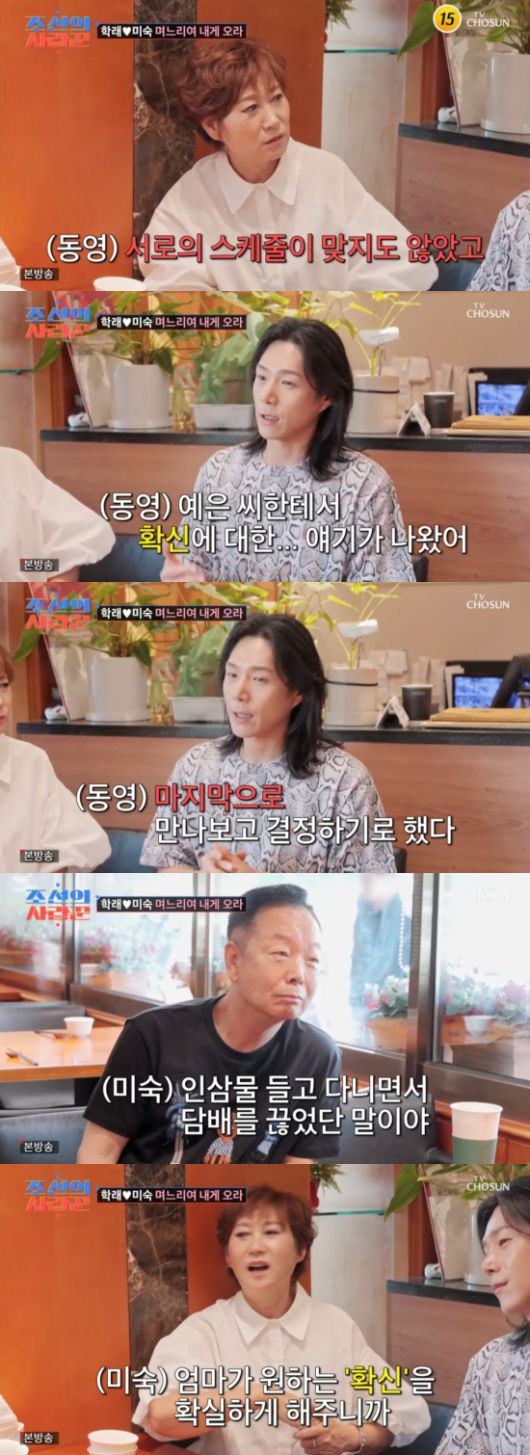 임미숙은 "여자는 확신이 중요하다. 어느 여자나 옛날이나 지금 세대나 마찬가지일 거다. 처음에 아빠 볼 때는 얼굴이 내 이상형이 아니다. 제일 싫어하는 상이다. 그런데 그게 다가 아니라 아빠가 끊임없이 엄마한테 편지를 쓰고 담배 피우는 남자가 싫다고 했더니 담배를 끊었다"라며 당부했다.
