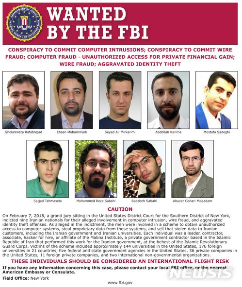 [워싱턴=AP/뉴시스] 미국 정부가 대학과 정부기관 상대로 해킹한 이란인 9명을 기소하고 기관 1곳을 제재했다. 연방수사국(FBI)이 대학, 민간단체, 정부기관의 민감한 정보를 해킹한 혐의로 조사하는 이란인 해커 9명의 수배 전단. 자료사진. 2026.03.24 |