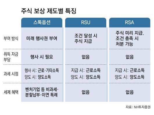 RSU는 일정 근속 기간이나 성과 등 특정 조건을 충족하면 미래의 정해진 시점에 주식을 무상으로 지급하기로 약속하는 제도다. 임직원은 별도의 자금 부담 없이 주식을 받을 수 있고, 주가가 폭락하지 않는 한 최소한의 가치는 보장받을 수 있어 안정성이 높다. RSA는 주식을 미리 지급하되, 일정 기간 근속이나 성과 등 조건을 충족해야만 처분할 수 있도록 제한을 두는 방식이다. 의결권, 배당권 등 주주로서의 권리는 조건이 충족되기 전이라도 행사할 수 있으며 이 역시 주식 지급 시점에 근로소득세가, 주식 매도 시 양도소득세가 발생한다.