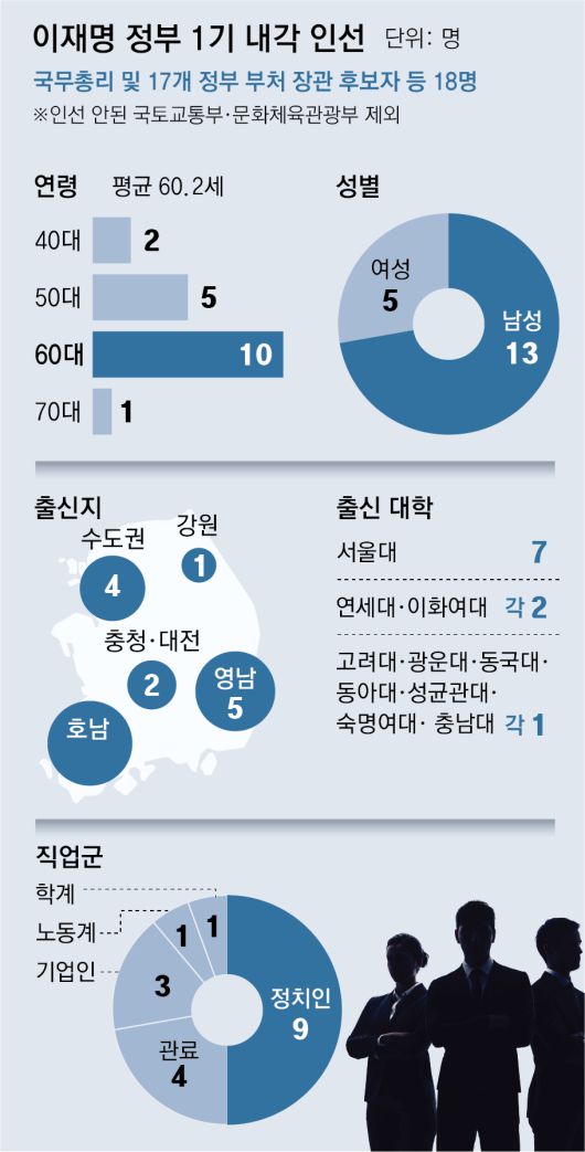 이재명 정부의 1기 내각 인선이 마무리 단계에 접어든 가운데 국무총리와 17개 정부 부처 장관급 인선은 출신 지역 및 대학 안배, 여성 비율 상향 등 특정 배경에서 쏠림 현상이 완화됐다는 평가가 나온다. 전임 윤석열 정부에 비해 출신지와 경력 등 특정 배경이 덜 고려된 실용주의 인선이 이뤄졌다는 것. 정치인 출신이 대거 내각에 진입하고 기업인 출신이 여럿 발탁된 반면 역대 정부에서 중용돼 왔던 대학교수 등 학자 출신은 드문 점도 이재명 정부 첫 내각의 특징으로 꼽힌다.