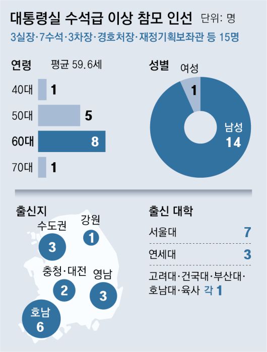 인선이 완료된 이 대통령의 초대 대통령실 수석급 이상 참모진의 경우 수석급 이상 15명의 평균 연령은 59.6세로, 60대가 8명으로 가장 많았다. 서울대도 7명으로 절반을 차지했고 여성은 오현주 국가안보실 3차장 1명에 그쳤다.