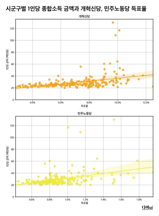두 후보의 또 다른 공통점도 있었다. 시군구별 1인당 종합소득금액과 4개 정당의 득표율을 비교했더니 더불어민주당과 국민의힘은 유의미한 상관관계가 나타나지 않았지만 개혁신당과 민주노동당은 대체로 소득이 높을수록 득표율도 높아지는 것으로 나타났다. 개혁신당은 1인당 종합소득금액과 0.402의 상관계수를, 민주노동당은 0.376의 상관계수를 나타냈다.