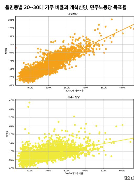 경향신문 데이터저널리즘팀 다이브가 실제 대선 투표 결과를 분석해보니 청년층 거주 비율이 높은 읍면동 지역일수록 이준석·권영국 후보의 득표율도 높았던 것으로 나타났다. 이 후보의 경우 상관계수가 0.879였고, 권 후보는 상관계수가 0.542로 측정됐다. 상관계수가 1에 가까울수록 청년층 거주 비율이 높아질 때 득표율도 함께 상승했다는 의미로 해석할 수 있다.