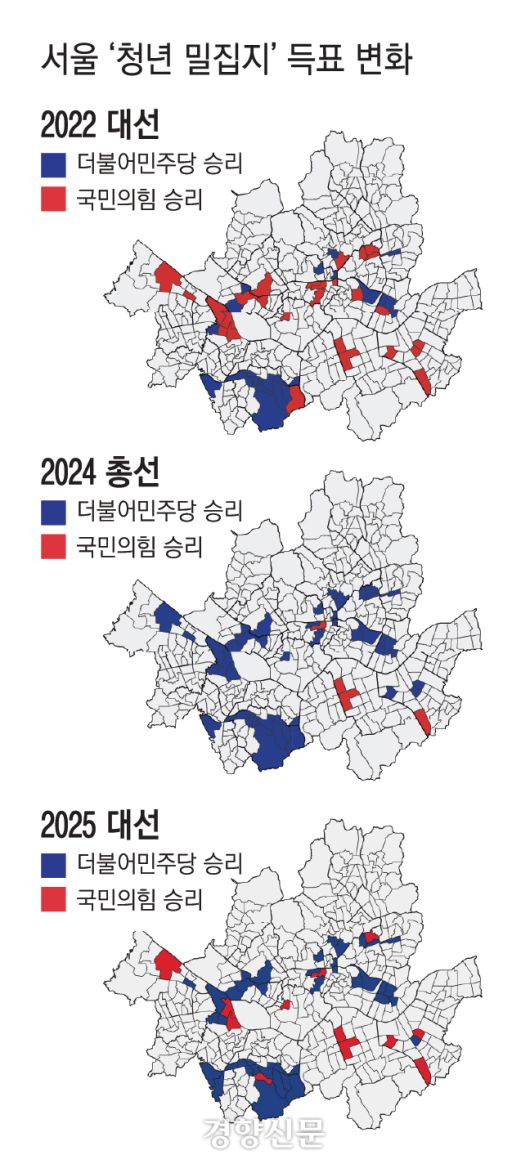 민주당이 지난해 총선에 비해 청년층의 민심을 더 파고들지 못했던 것도 눈여겨볼 만하다. 서울시 행정동 중 20~30대 거주 비율이 40%가 넘는 52개 동(2025년 대선에서는 53개)의 대선 투표 결과를 분석해보니 20대 대선에서는 국민의힘 승리 지역이 27개였고 민주당 우세 지역이 25개였지만 지난해 총선에서는 민주당이 47개, 국민의힘이 5개였다. 총선을 거치면서 민주당의 압도적 우세로 뒤바뀐 것이다. 그러나 이번 대선에서는 민주당 승리 지역이 41개, 국민의힘이 12개로 민주당 우세 지역 숫자가 다소 줄었다.