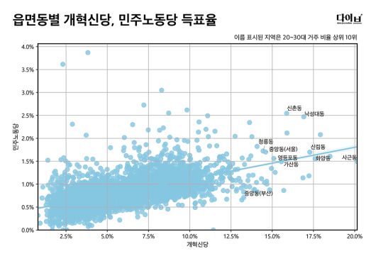 이런 공통된 특성 때문인지 개혁신당과 민주노동당의 득표율 역시 상관계수가 0.573으로 높은 상관관계를 보였다. 개혁신당의 지지율이 높은 지역에서 민주노동당의 득표율도 대체로 높았다는 의미다.
