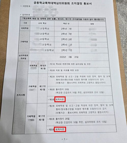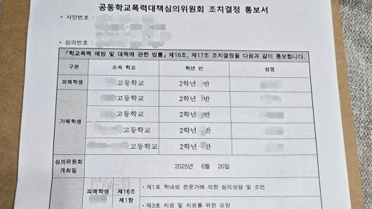 심의위는 가해 학생들로부터 A군을 보호하기 위해 접촉 금지를 포함, 협박 및 보복 행위 금지 조치도 내렸습니다.