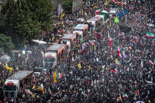 지난 28일(현지시각) 이란 수도 테헤란의 엥겔라브(혁명) 광장에서 이스라엘의 공습으로 사망한 이란군 지휘관들과 과학자들의 장례식이 열리고 있다. 테헤란/UPI 연합뉴스