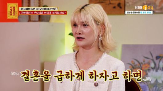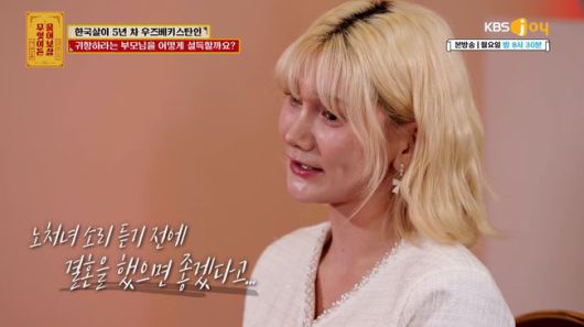 “우즈베키스탄으로 돌아오라는 이유가 있는 거냐”는 이수근의 물음에, 사연자는 “우리 나라에서는 여자들이 일찍 결혼하는 문화가 있어서, 스무 살 이후에 보통 결혼을 한다. 지금 23살이라, 엄마가 노처녀 소리 듣기 전에 얼른 와서 결혼하라고” 라고 답했다.