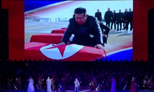 북한 조선중앙TV는 지난달 30일, 김정은 북한 국무위원장이 방북한 올가 류비모바 러시아 문화장관을 접견하고 예술공연을 관람했다고 보도했다. 예술인 공연 중 무대 배경화면에 김정은 국무위원장이 러시아 파병 북한군 전사자 관을 어루만지며 애도하는 장면을 공개했다.. 사진=조선중앙TV 캡쳐 |