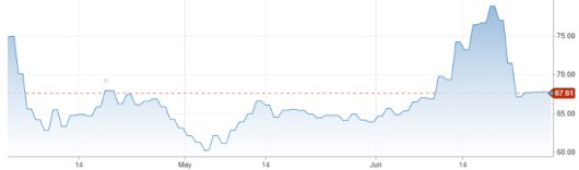 지난 3개월 북해산 브렌트유 가격 추이. 단위: 달러/배럴. 자료: CNBC |